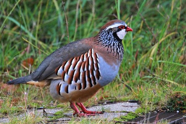 La perdrix rouge a le bec rouge. Les yeux sont bruns, entourés d’un cercle oculaire rouge. Les pattes et les doigts sont rouges avec un petit ergot.